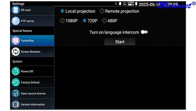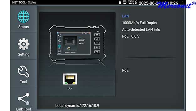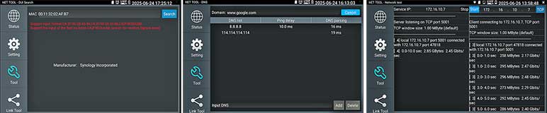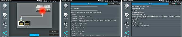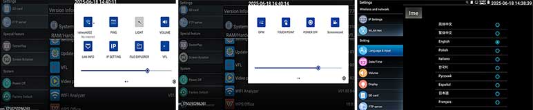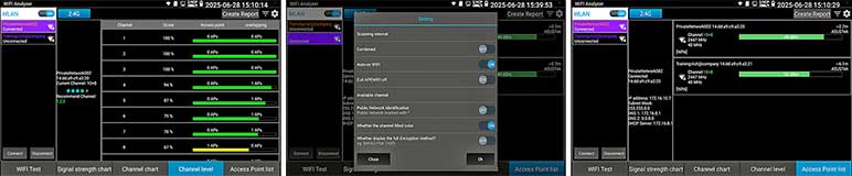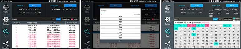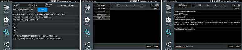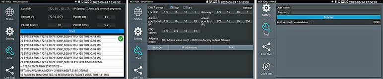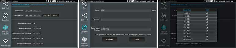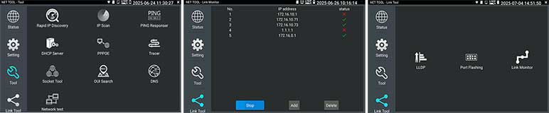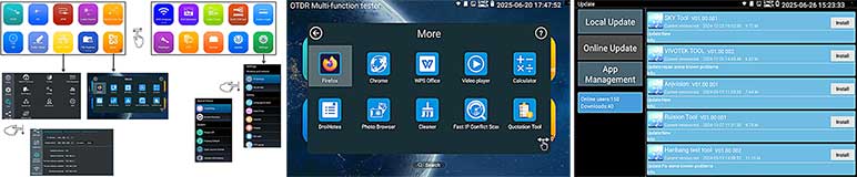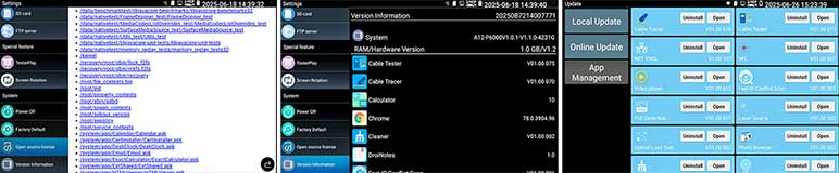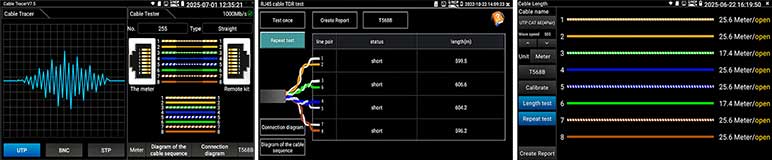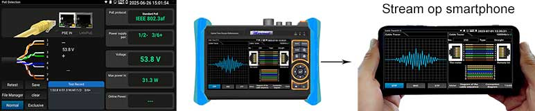Kies op het touchscreen uit een scala aan instrumenten voor: TCP/IP: LAN/WAN Dataload, Ping, Trace, MAC, LLDP, DHCP server, browsers enz. Fiber: OTDR, OPM, VLC, LS, certificatie enz. Ethernet: CAT 1-8S met TDR, PoE,  en certificatie rapport. Wi-Fi: SSID, MAC, Strength, Channel levels, Acces point, enz. Camera: multiple tool set, Onvif enz. Kabellengtemeter: TDR 3 km, Calculators: Network, IP, Subnet, HEX-DEC-OCT-BIN, offertes en kabelverbruik. Kabelzoeker: 1 maal lopen schakelt direct om als de remote wordt aangesloten met resultaat aan beider uiteinde op de smartphone. Elektra: detectie 230 V, Fase nul. USB: power output met vermogens meting. FTP: server. Stream: op smartphone en intercom met gratis APP. Voor details zie een aantal screenshots hieronder en de Specificatie lijst. Gebaseerd op een Android/Linux platform met standaard APP's gecombineerd met hoogwaardige hardware voor Ethernet, TCP/IP, Fiber en Wi-Fi. Het meetresultaat kan vanaf de tester per email worden verzonden.