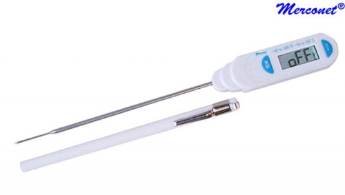 1. How do I check calibration of my pocket thermometer? Place thermometer in a solution of crushed ice and water, swirl the water around and temperature should read close to 32°F. 2. Does the whole stem need to be immersed to get an accurate reading? The sensor is in the tip of the probe and needs to be 1.27cm (1/2 inch) into whatever you are measuring. 3. What battery does my pocket thermometer use? The LR44 button battery is used in pocket digital thermometers.